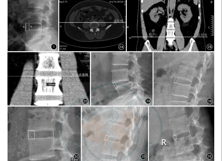 图1 腰椎失稳症患者侧位X线影像测量腰推间隙参数 a:椎间隙前缘高度,为相邻两椎体前缘点间的直线距离; b:椎间隙盘状小凹前端高度,为椎间隙盘状小凹两前缘点间的直线距离;c:椎间隙后缘高度,为相邻椎体两后缘点间直线距离 图2 测量方法 2A 将Philips Dicom Viewer软件的定位线工具定位于椎体横断面CT影像 2B 与2A相对应的椎体冠状面CT影像 2C 在椎体冠状面影像上做中心线,取椎体两侧最高点(双头箭)做连线,测量椎体中心线与椎体接触点至椎体两侧最高点连线的垂直距离 图3 腰椎失稳症病变椎间隙X线测量分型 3A AD型 3B AE型 3C BD型 3D BE型 3E CD型