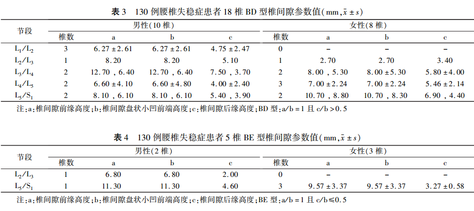 130例209个腰椎间隙中,AD型占78.0%(163/209),AE型10.5%(22/209),BD型占8.6%(18/209),BE型占2.4%(5/209),CD型0.5%(1/209),CE型未见。各型参数值见表1~4,其中1例L4/L5节段CD型椎间隙女性患者a、b、c值分别为4.70、5.30、3.40mm。