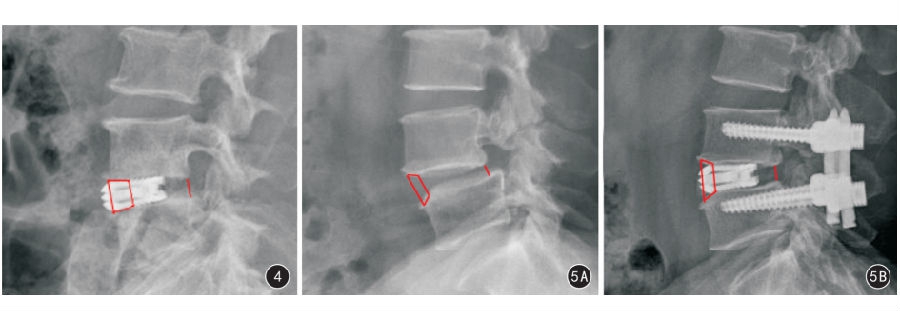 图4 患者女,56岁,腰椎失稳症患者,行后路镜下端膨胀融合器置入融合术。术后3个月X线片示端膨胀融合器在AD型椎间隙中的置入位置,稳定性好 图5 患者男,52岁,腰椎失稳症合并I度腰椎滑脱患者,行后路镜下端膨胀融合器置入融合术联合经皮椎弓根钉内固定术 5A 术前侧位X线显示为AD型 5B 术后3个月侧位X线片显示转为AE型