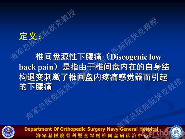 椎间盘源性下腰痛(Discogenic low back pain)是指由于椎间盘内在的自身结构退变刺激了椎间盘内疼痛感觉器而引起的下腰痛。但是,目前临床上存在概念混淆、应用扩大化、诊断标准不一和治疗方法不明确的现状。