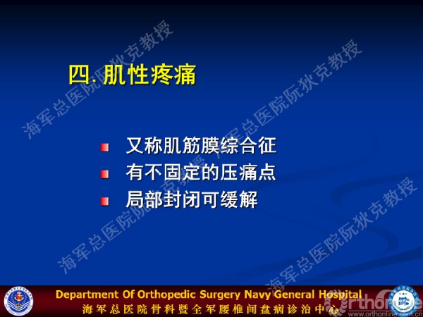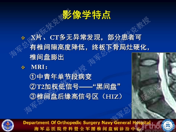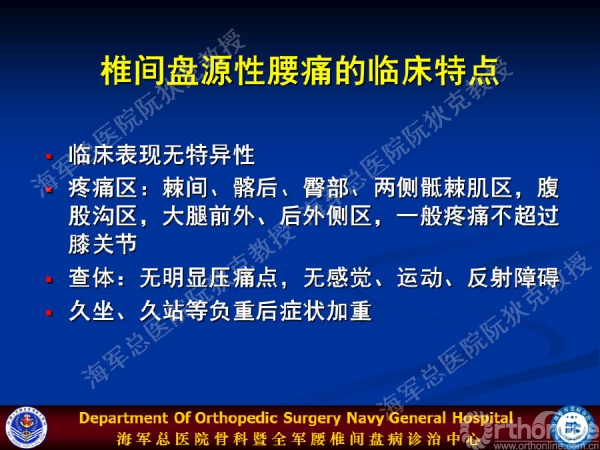其实,椎间盘源性腰痛具有显著的临床特点:临床表现无特异性;疼痛区分布于棘间、髂后、臀部、两侧骶棘肌区,腹股沟区,大腿前外、后外侧区,一般疼痛不超过膝关节;查体无明显压痛点,无感觉、运动、反射障碍;久坐、久站等负重后症状加重。