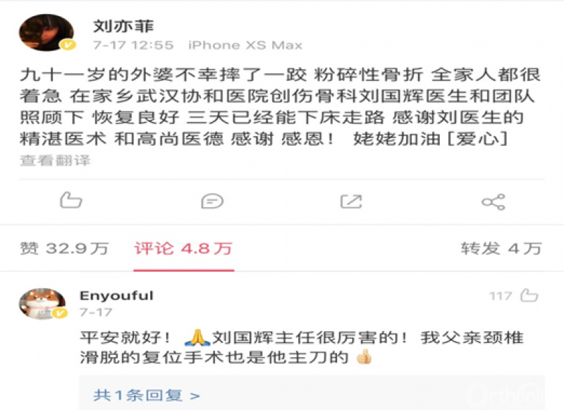 近日,“神仙姐姐”刘亦菲的一则微博动态引起了不少人的关注,91岁老年人不慎摔伤后前往华中科技大学附属协和医院(下称武汉协和医院)骨科就诊,行X线检查提示左侧股骨转子间骨折,该院创伤骨科刘国辉主任接诊后随即收治老人入院。
