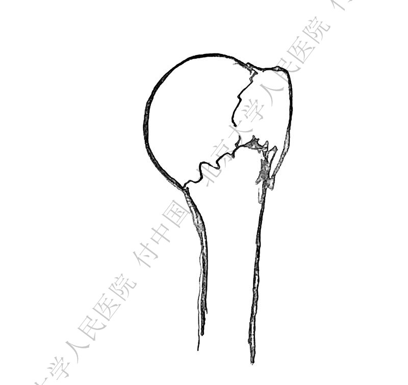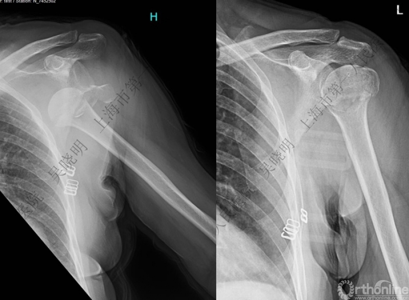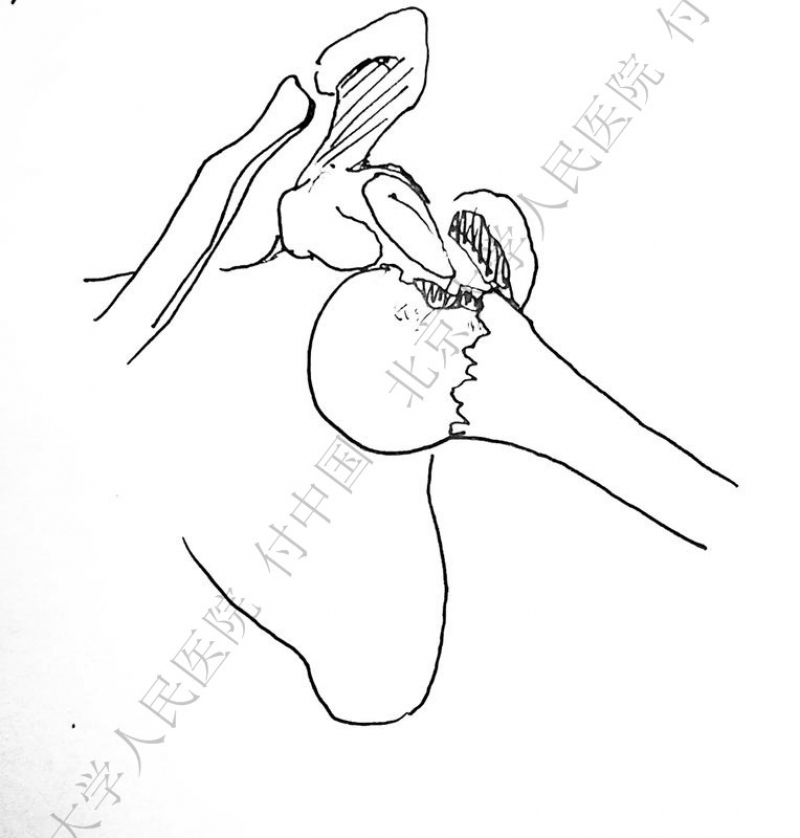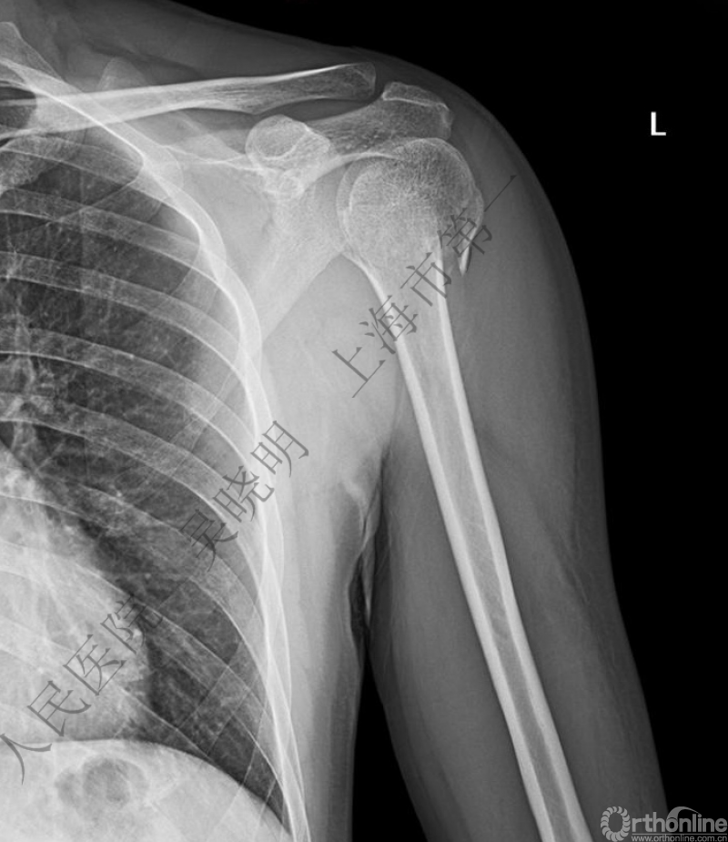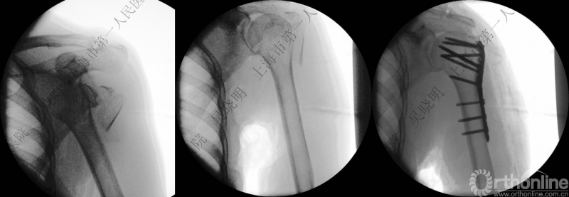 对这型骨折进行手法复位会导致肱骨头和肱骨干之间的连续性消失。肱骨头和肱骨干之间连续性尚存,肱骨头前脱位(Robsion 3b)