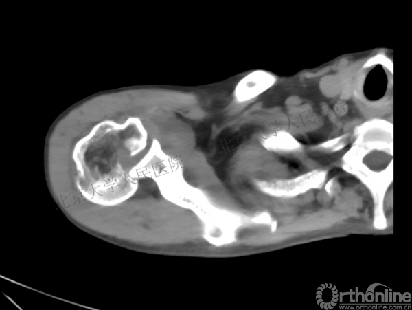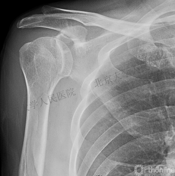 (一)查体:右肩关节肿胀,前方空虚,喙突凸起可触及。后方饱满,可触及肱骨头。局部压痛明显,活动受限。右手拇指指尖部轻度麻木,末梢血运良好。