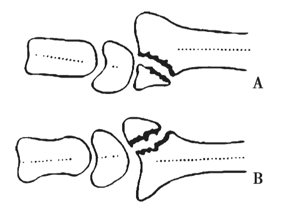 图1 Barton骨折示意图A.掌侧Barton骨折;B.背侧Barton骨折
