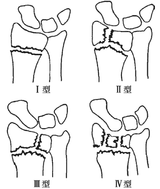 指桡骨远端2~3cm范围内松质骨骨折,向背侧移位者。可累及桡腕关节或远侧尺桡关节。1814年为Colles详细描述,沿用至今。此类骨折为最常见骨折之一,多见于中、老年人。女性多于男性。多为间接暴力引起,肘部伸直,前臂旋前,腕背伸位跌倒所致。伤后腕部疼痛、肿胀,可出现“银叉样”畸形或“枪刺样”畸形,腕关节、前臂旋转活动和手指活动因疼痛而受限。典型X线片表现为:桡骨远端骨折块向背侧和桡侧移位,骨折块向掌侧成角,桡骨短缩,桡骨远端骨折块旋后。