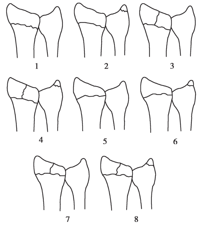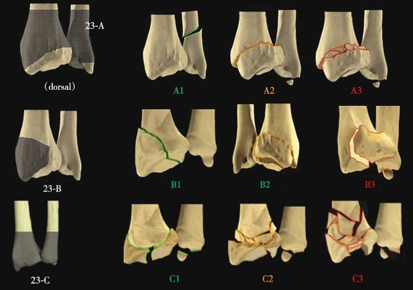桡骨远端骨折分类方法繁多,常以人名方法命名,例如Colles骨折、Barton骨折(图1)、Smith骨折等。除此之外还包括Mayo关节内骨折分型(图2)、Frykman分型(图3)、AO分型等分类系统。广泛应用的分型是AO分型。桡骨远端解剖部位为23,依累及关节与否及其程度分为A、B、C三个类型(图4)。