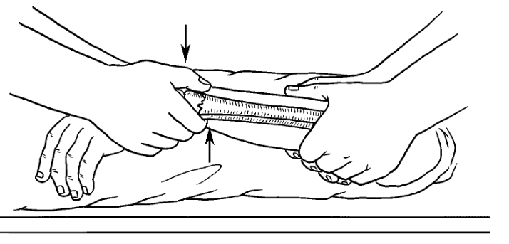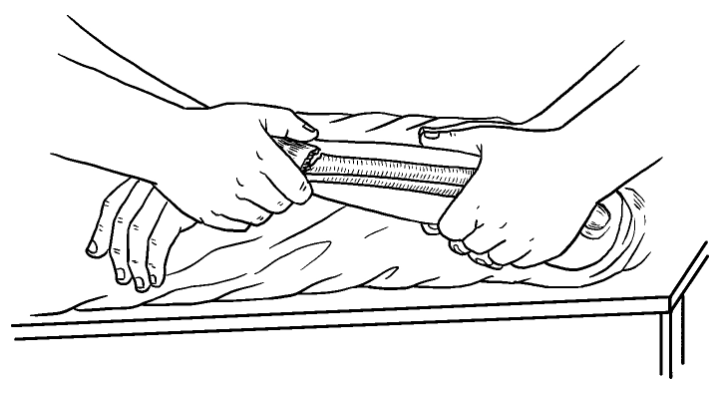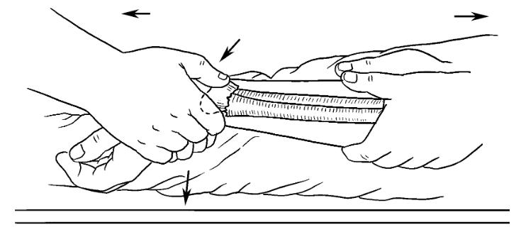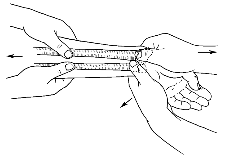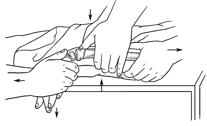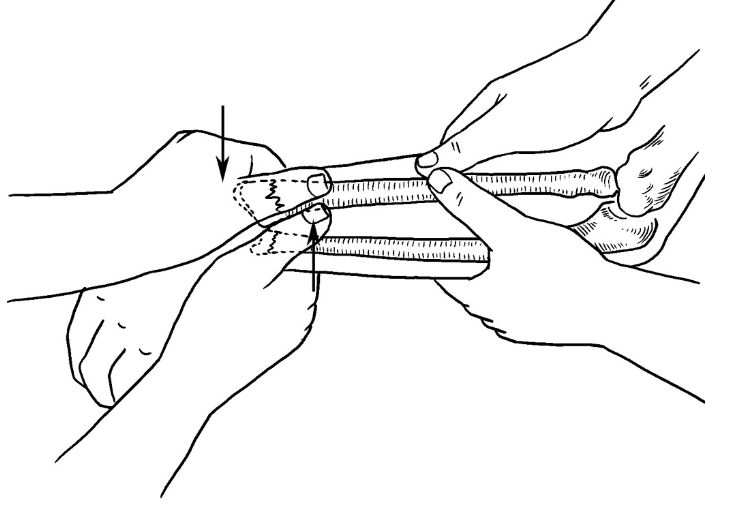 患者屈,将前臂置于中立位或旋前位,助手双手握住前臂近侧,术者面对患者,将双拇指置于骨折远段(即靠近腕关节骨折段)背侧。双手示指桡侧托住近段的掌侧。在持续牵引下(图5),推挤,纠正骨折远段的桡偏(图6)。桡偏纠正后再纠正掌背侧移位,即双手拇指向下压骨折远段,其余手指向上托骨折近段,加大牵引并骤然用力纠正骨折段背侧移位(为便于施力,在施力过程中术者可由站立位转为半蹲位)(图7)。