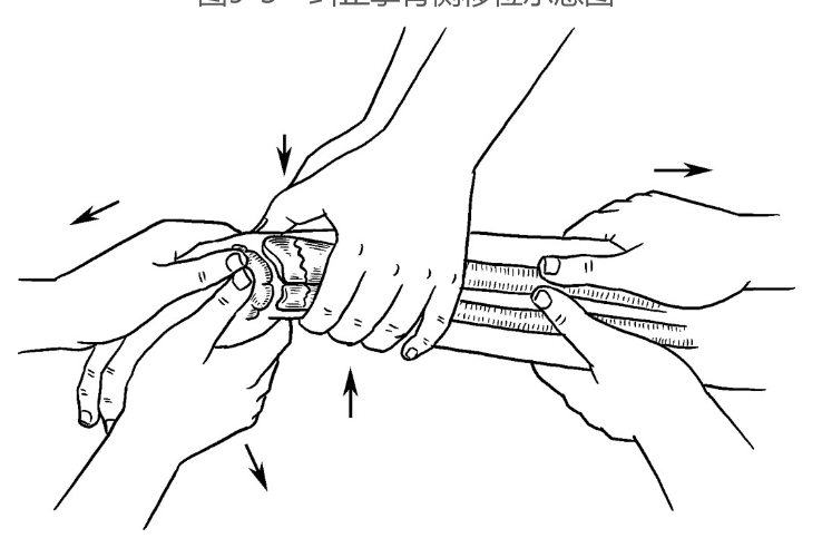 一位助手握着前臂近侧,另一助手握住患者腕部,做相反方向牵引,术者只负责复位。先纠正骨折远段桡侧移位,继之,在助手配合下,纠正骨折背侧移位。此种复位方法,复位效果更充分,但需助手密切配合用力(图8-9)。