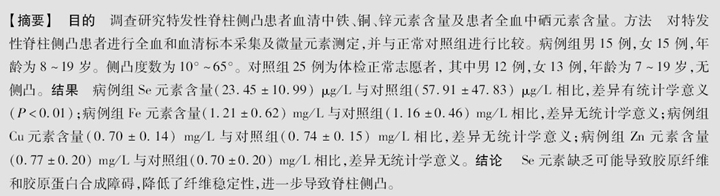 特发性脊柱侧凸患者全血中硒元素和血清中铁、铜、锌元素含量的变化