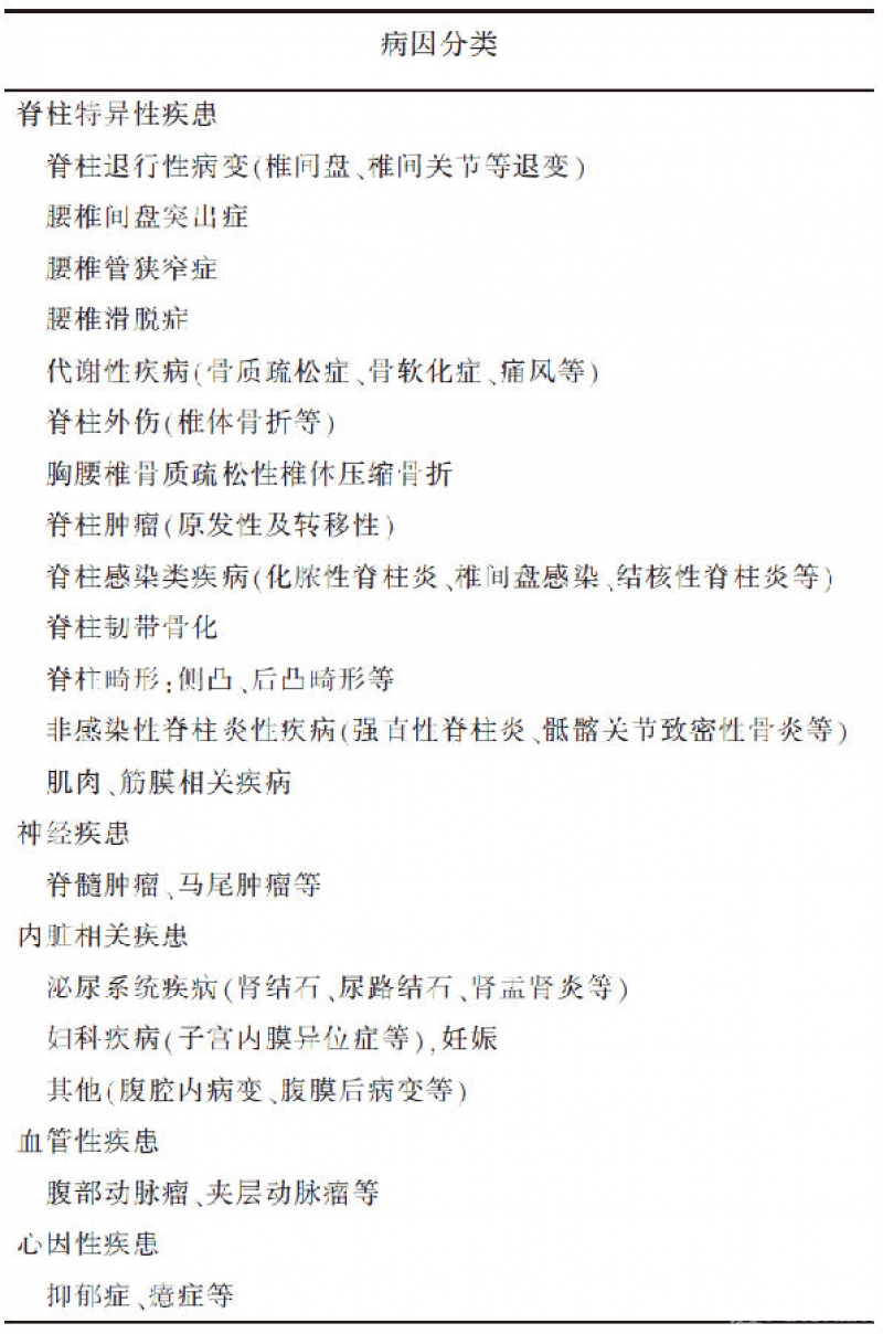 特异性LBP的病因主要包括6类,即脊柱特异性疾患、神经疾患、内脏系统疾患、血管性疾患、心因性疾患及其他因素(表2)[1、10、44]