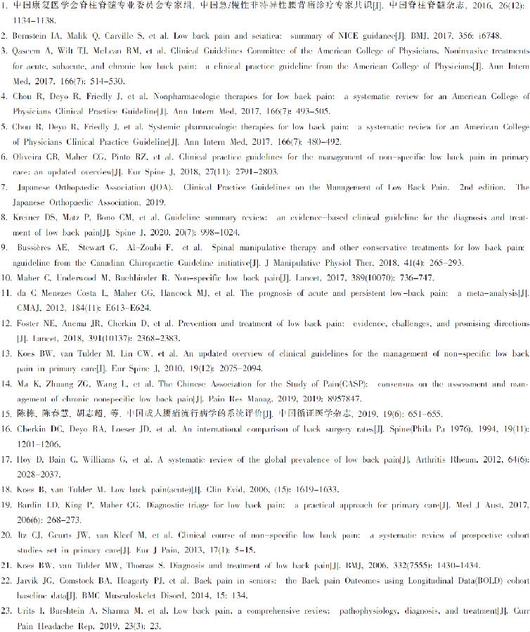 近5年来,国内和国际上发表了多篇有关LBP的诊疗指南和共识,主要包括中国康复医学会脊柱脊髓专业委员会专家组2016年制定的《中国急/慢性非特异性腰背痛治疗专家共识》[1]、2017年英国国家健康和保健医学研究所(the National Institute for Health and Care Excellence,NICE)制定的《腰背痛与坐骨神经痛NICE指南》[2],2017年美国医师协会与疼痛协会发布的《急性、亚急性和慢性腰背痛非侵入性管理临床实践指南》[3]、《腰背痛的非药物治疗临床实践指南》[4]、《腰背痛药物治疗临床实践指南》[5],2018年在欧洲脊柱外科杂志上发表的《初级保健卫生机构非特异性腰背痛的临床实践指南更新》[6],2019年日本骨科学会发布的《腰背痛诊疗指南(第2版)》[7],2020年北美脊柱外科学会发布的《腰背痛诊疗指南》[8]。此外还包括针对LBP某一特定治疗方法所发布的指南,如2018年加拿大脊柱神经学会发表的《对于腰背痛的脊柱手法治疗和其他保守治疗指南》[9]