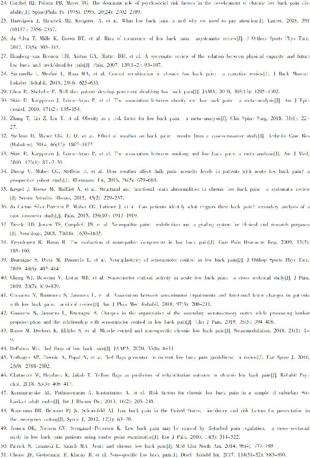 LBP:LBP是一种以症状命名的疾病[7、10],临床上对于腰背部的疼痛、不适等症状统称为腰背痛,该症状可能和多种病理情况及疾病相关,或找不到明确的致病因素[6]