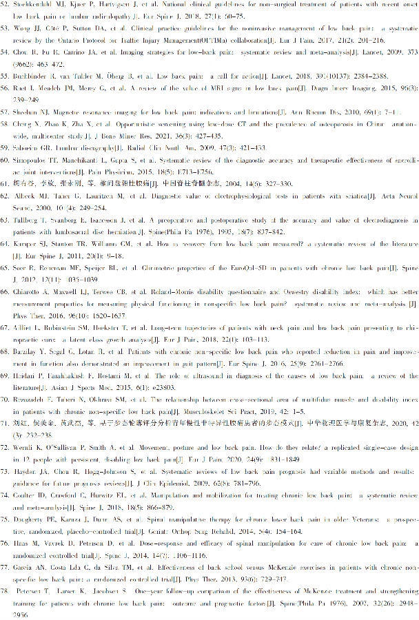 文献纳入过程:参照2020年NASS指南的文献检索原则,于中国知网、万方数据知识服务平台数据库、中国生物医学文献数据库、PubMed数据库中对中英文文献进行检索,以[腰背痛(back pain or low back pain)or非特异性腰背痛(nonspecific low back pain)or特异性腰背痛(specific low back pain)]and[定义(definition)or自然病程(natural history)or临床分期(clinical course)or流行病学(epidemiology)or病因(etiology)or症状(symptom)or体征(sign)or辅助检查(auxiliary examination)or影像学(imaging)orX线(X ray)orCT(computer tomography)orMRI(magnetic resonance imaging)or骨密度(bone density)or造影(radiography)or诊断(diagnosis)or治疗(treatment)or康复治疗(rehabilitation)or药物治疗(drug or medical therapy or medication)or中医中药(traditional Chinese medicine or Chinese herbal medicine)or运动疗法(exercise therapy)or牵引(traction)or物理治疗(physical therapy)or支具(support)or认知行为治疗(cognitive behavioral treatment)or健康教育(health education)or手法治疗(manipulation)or按摩(massage)or腰痛学校(low back pain school)or预后(prognosis)]等为检索式相互组合,文献排除标准为研究对象18岁以下、动物实验研究、会议摘要、会议论文、学位论文。