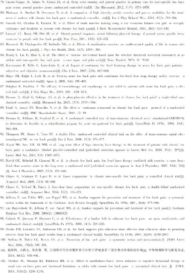 急性、亚急性NSLBP与慢性NSLBP治疗的侧重点不同,对于急性和亚急性NSLBP,应着重于减轻疼痛、避免腰背痛加重,不建议单纯卧床制动休息,应辅以适量运动[3]。对于慢性NSLBP,强调以LBP的自我管理为主,以物理治疗、心理疗法等为补充,较少强调药物治疗和侵入性治疗,且更应重视运动康复的作用[3、12]。(2级推荐)