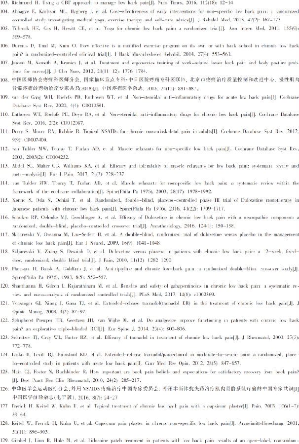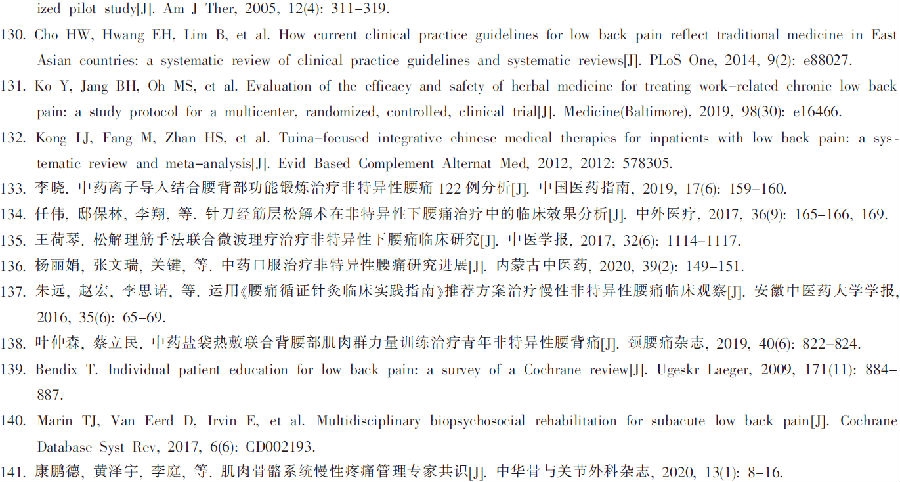 文献纳入截止时间为2020年12月,共检索到英文文献7952篇,中文文献3255篇。文献纳入顺序优先选择系统性综述、荟萃分析、高质量随机对照研究,其次为前瞻性非随机对照研究、回顾性队列研究和病例对照研究,最后为系列病例报告、临床经验、专家委员会意见等。 专家组通过阅读文献标题、摘要和原文的方式进行筛选,除2019年日本骨科学会发布的《腰背痛诊疗指南(第2版)》之外,最终纳入文献140篇,其中中文文献14篇、英文文献126篇。