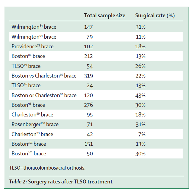 表2 不同研究报道的支具治疗后手术率