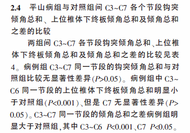 结果 平山病患者C3~C7同一节段左右两侧的钩突基底宽、钩突高、钩突间距、钩突倾角、下终板倾角均无显著性差异(P>0.05)。