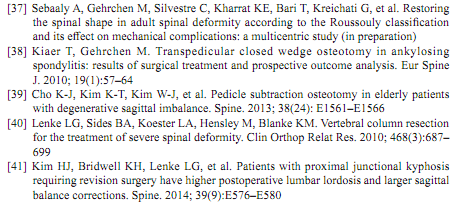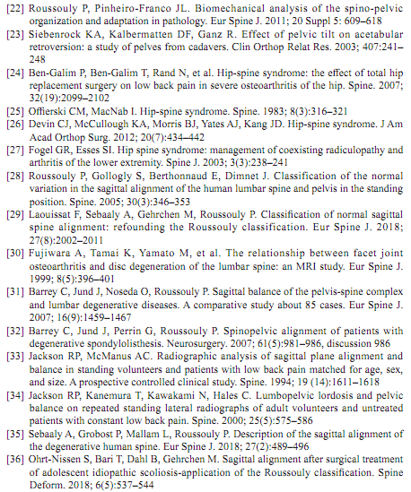 另一方面,髋关节炎可能由于骨盆的后倾限制而减少髋的伸展,加重脊柱的不平衡。在这种情况下,关于髋关节假体的决定必须在脊柱手术之前做出[24]。有时,髋关节关节炎和腰椎管狭窄的叠置,可能导致由于髋关节和神经系统的股骨疼痛而引发大腿疼痛的诊断错误[25,26,27]
